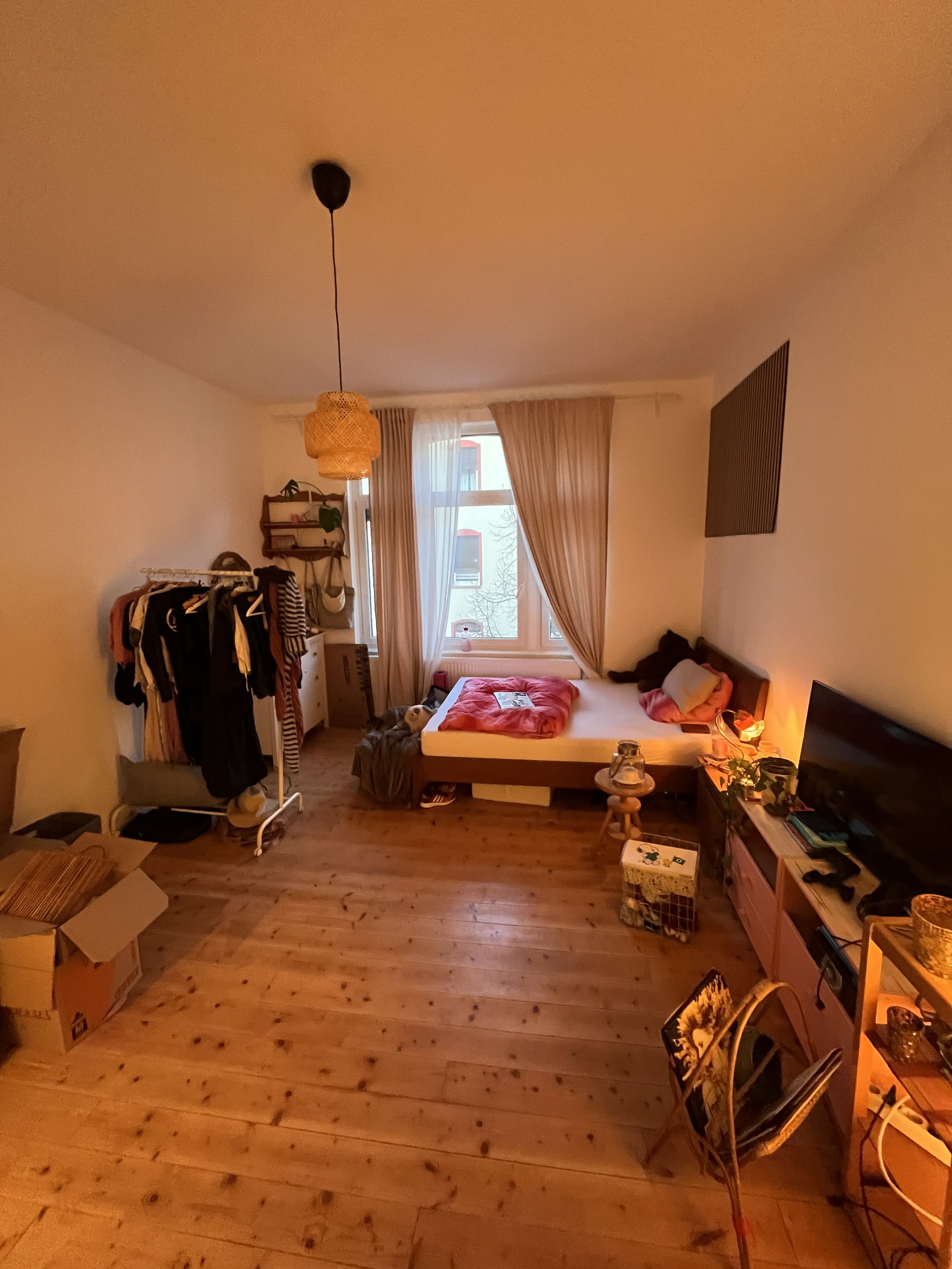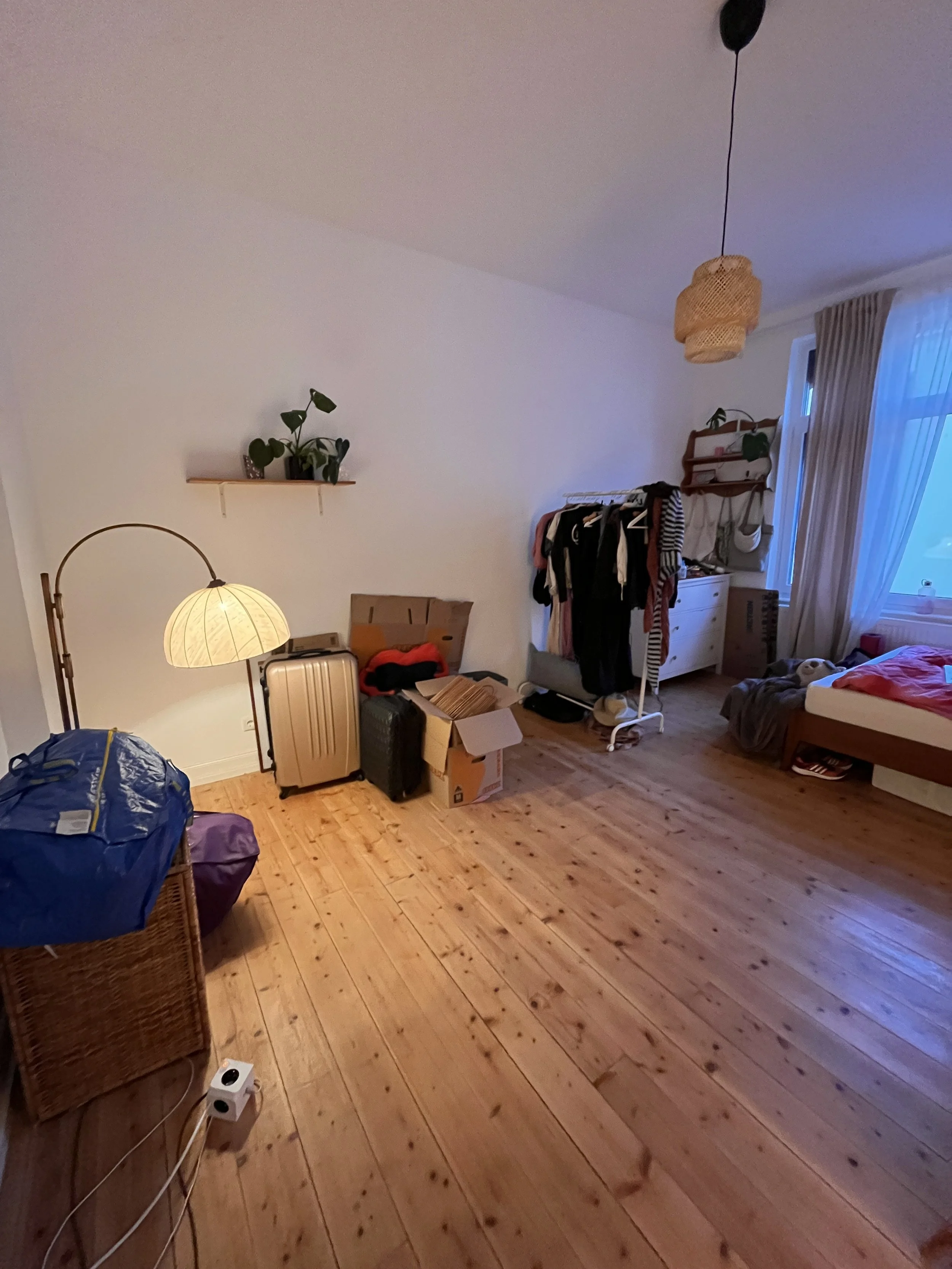 Das Zimmer ist etwa 27 Quadratmeter groß, hat hohe Decken und einen schönen Parkettboden. Durch die riesigen Fenster kommt viel Licht rein. Alleine die Größe sorgt dafür, dass man es sich genau so einrichten kann, wie man mag :) Ich hatte ein sehr großes Sofa hier drin stehen, was super war für Abende mit Freunden. Meine Vormieterin hatte dafür ein kleineres Sofa und eine Homeoffice Ecke. Die gesamte Wohnung wurde 2024 renoviert und die Ausstattung in Küche und Bad sind somit noch ziemlich neu. Wir haben eine Spülmaschine und einen Waschtrockner. Zusätzlich zu dem großen Badezimmer gibt es außerdem ein kleines Gästebad. WG-Leben Aktuell sind wir eher eine Zweck-WG, da wir berufstätig sind und uns somit nicht viel sehen. Die Mädels sind auch öfters am Wochenende nicht da, also hat man da schonmal sturmfrei :) Gerne wird hier schonmal unter der Dusche, beim Putzen oder beim Fertigmachen zum Ausgehen laut Musik gehört. Prinzipiell sind die Mädels offen für Austausch und nettes Quatschen in der Küche, aber man hat auch gerne seine Privatsphäre und seinen Rückzugsraum. Sonstiges Die Mindestmietdauer liegt bei einem Jahr. Bei ausländischen Interessenten ist eine unbefristete Aufenthaltsgenehmigung eine Voraussetzung. Wir sind aktuell eine reine Frauen-WG, weshalb Nachrichten von Männern nicht berücksichtigt werden. Die anderen Mitbewohnerinnen sind zudem alle in ihren frühen Zwanzigern, weshalb wir eine Mitbewohnerin in einem ähnlichen Alter suchen.