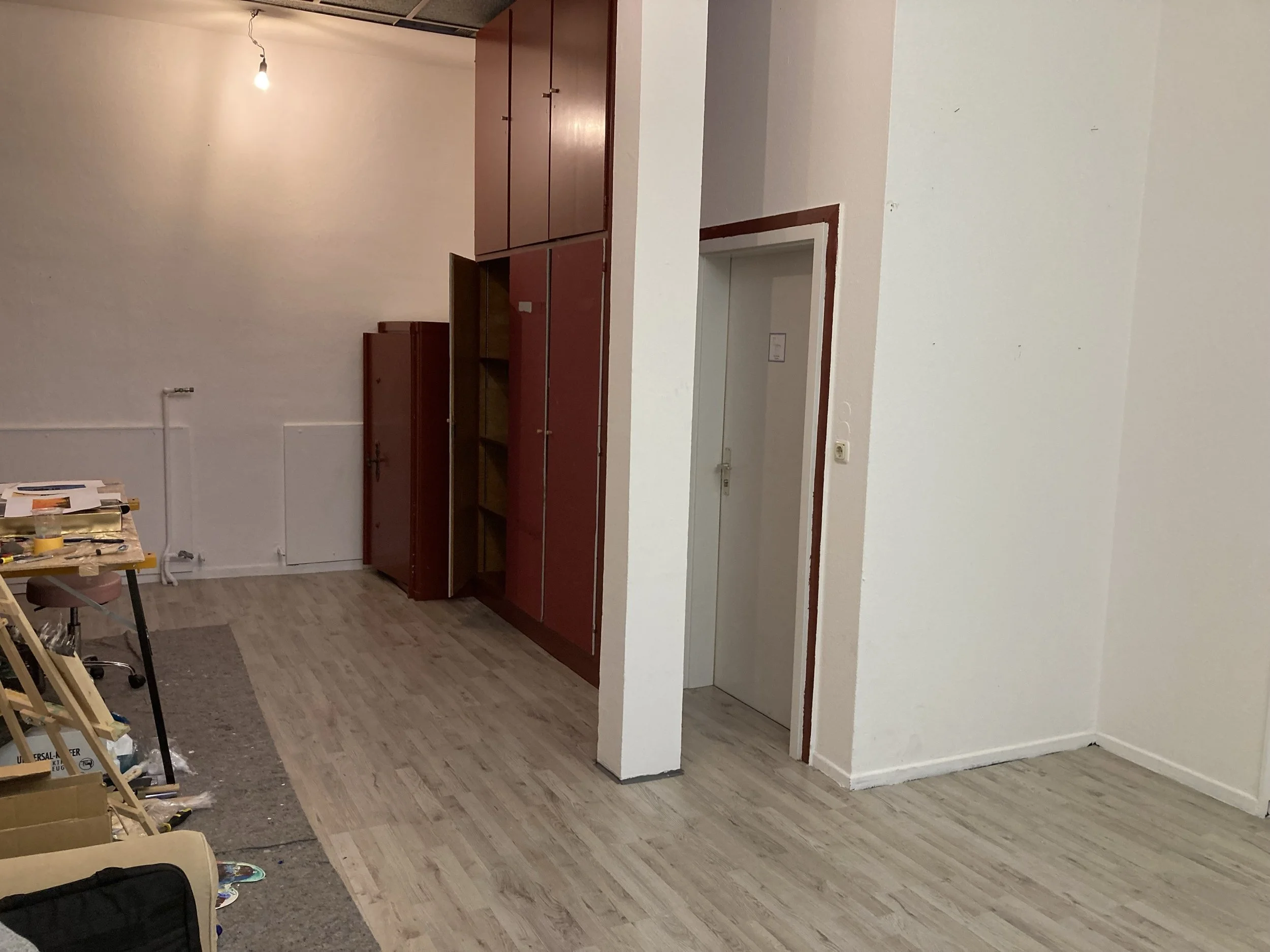 Der Raum eignet sich super zum Malen, Nähen, Zeichnen, oder sonstige kreative Tätigkeiten. Im Gebäude gibt es eine Küche und Toiletten zur geteilten Nutzung mit den übrigen Mietern. Örtlich befindet sich das Ganze auf dem Fredenhagen Gelände direkt neben der Kommune 2010, es gibt also genügend Möglichkeiten sich mit anderen zu vernetzen fals gewünscht. Ich selbst nutze den Raum zum Malen und bin eher unregelmäßig an Wochenenden oder auch mal Abends vor Ort.